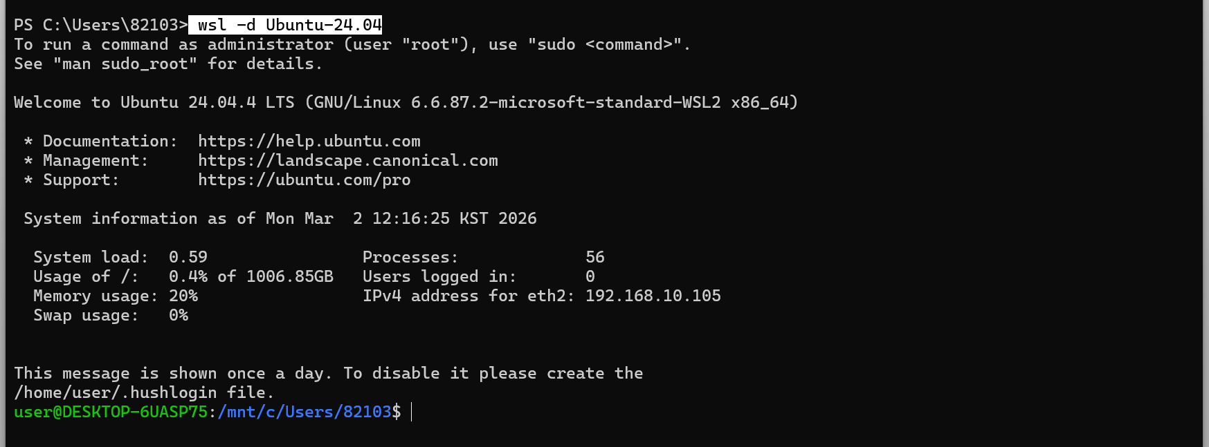 wsl를 통해서 OpenClaw를 설치한 Linux 터미널에 접속한다.