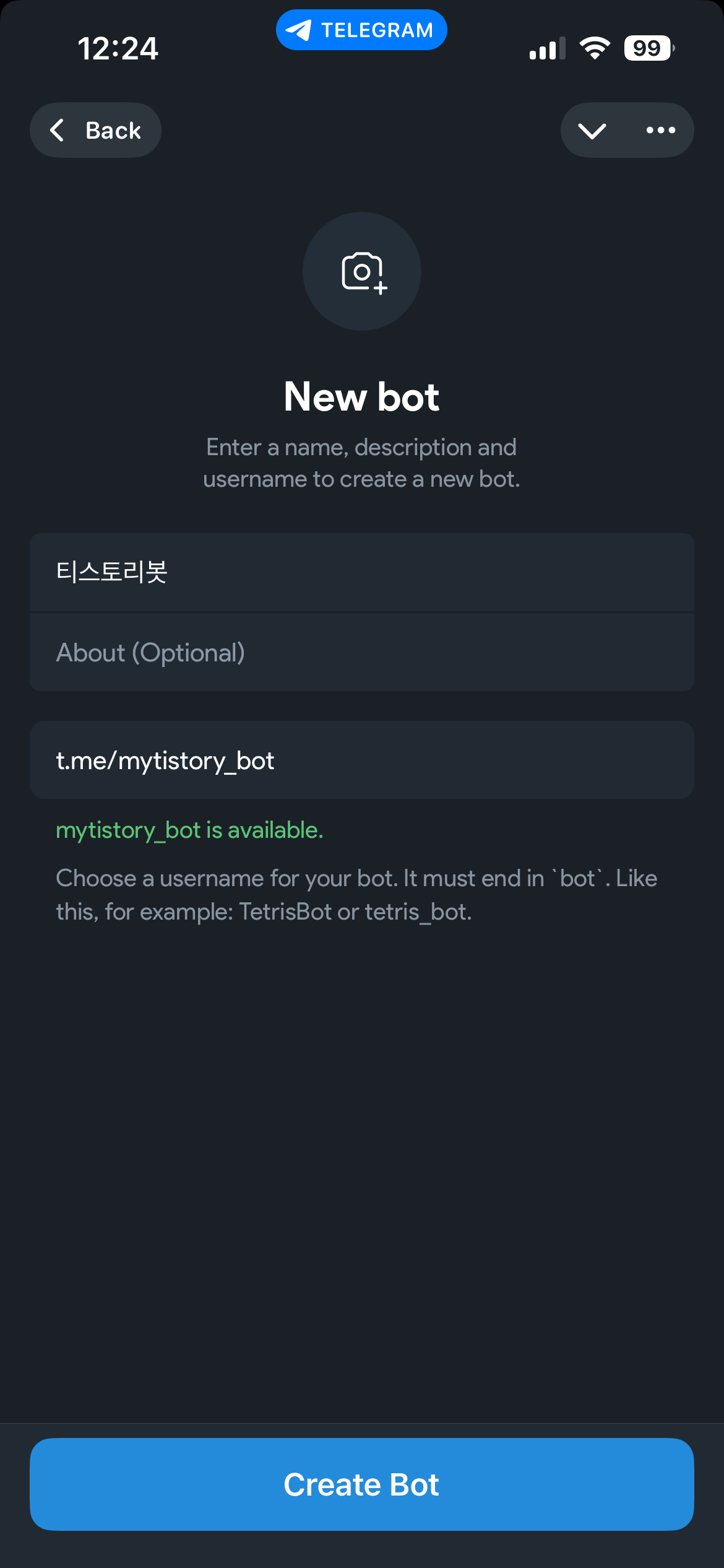 나는 Bot Name은 "티스토리봇", username_bot에는 mytistory_bot을 적었다.