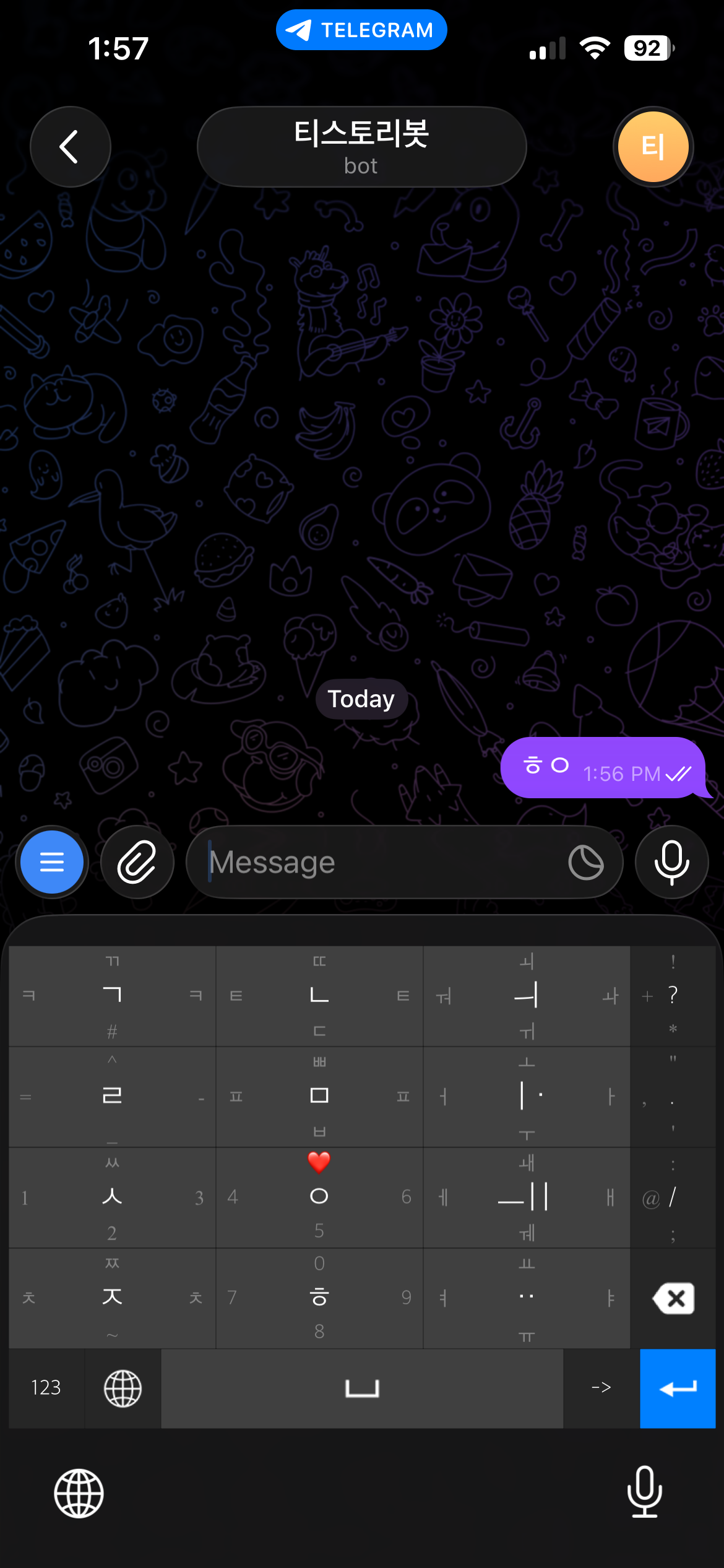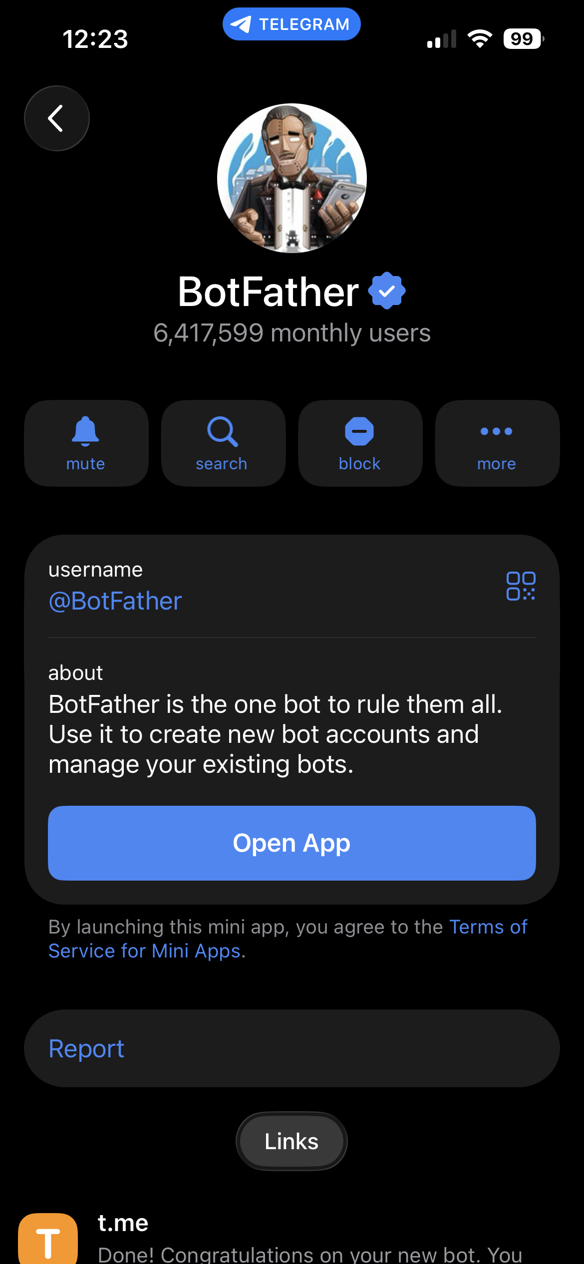 만약 메세지를 주고 받은 적이 있어서 채팅 탭으로 간다면, 상단의 BotFather 프로필을 선택하면 된다.