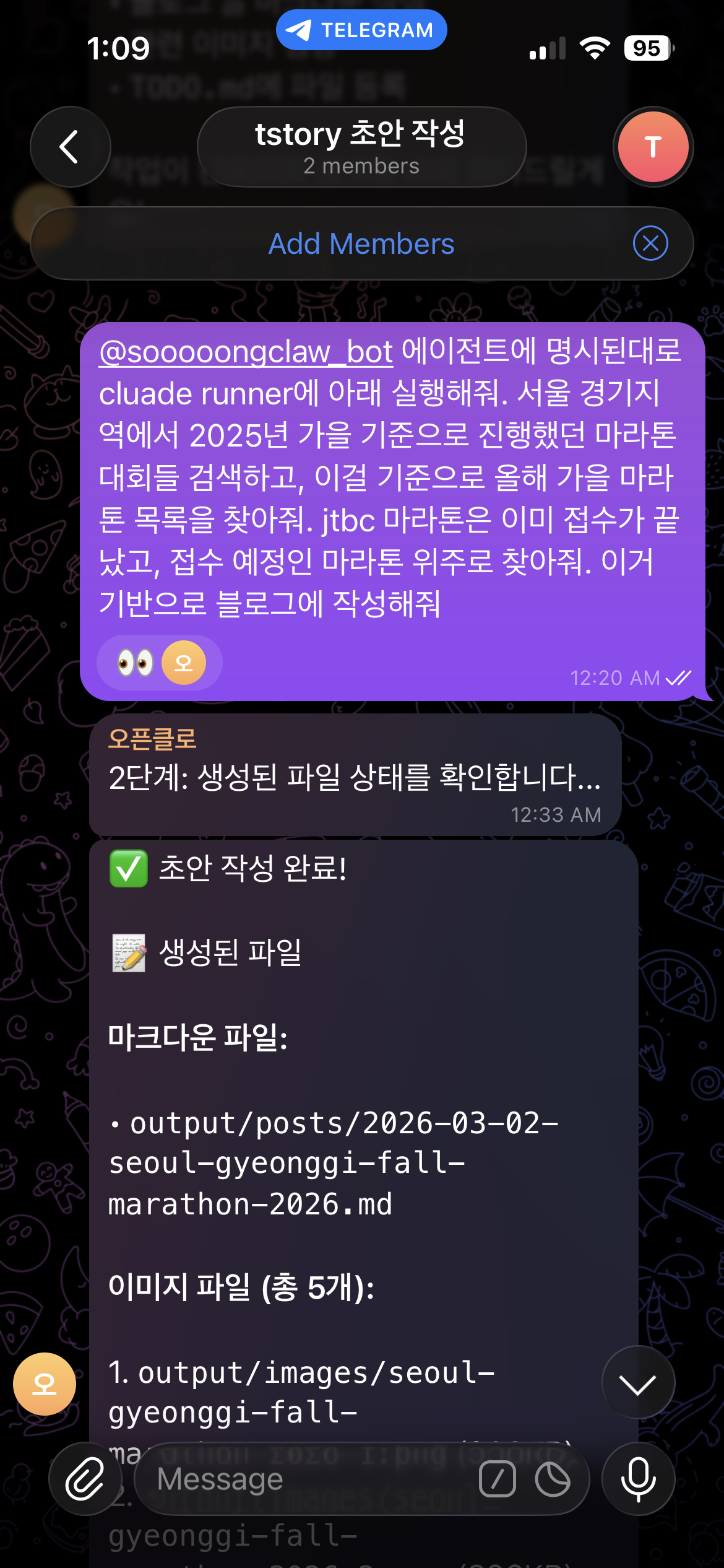 아래는 텔레그램을 이용해서 블로그 작성을 요청한 글이다.