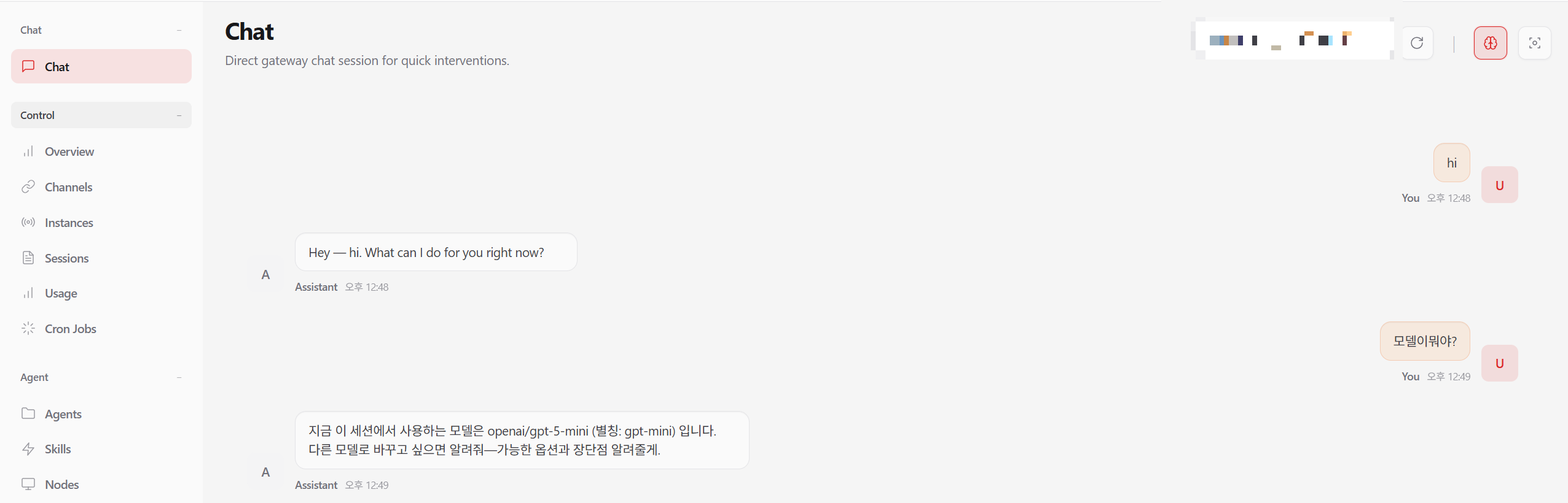 아래처럼 dashboard에서 오른쪽 위에 모자이크한 영역을 바꿔서 선택하면 해당 내용을 openClaw에서 확인할 수 있다.