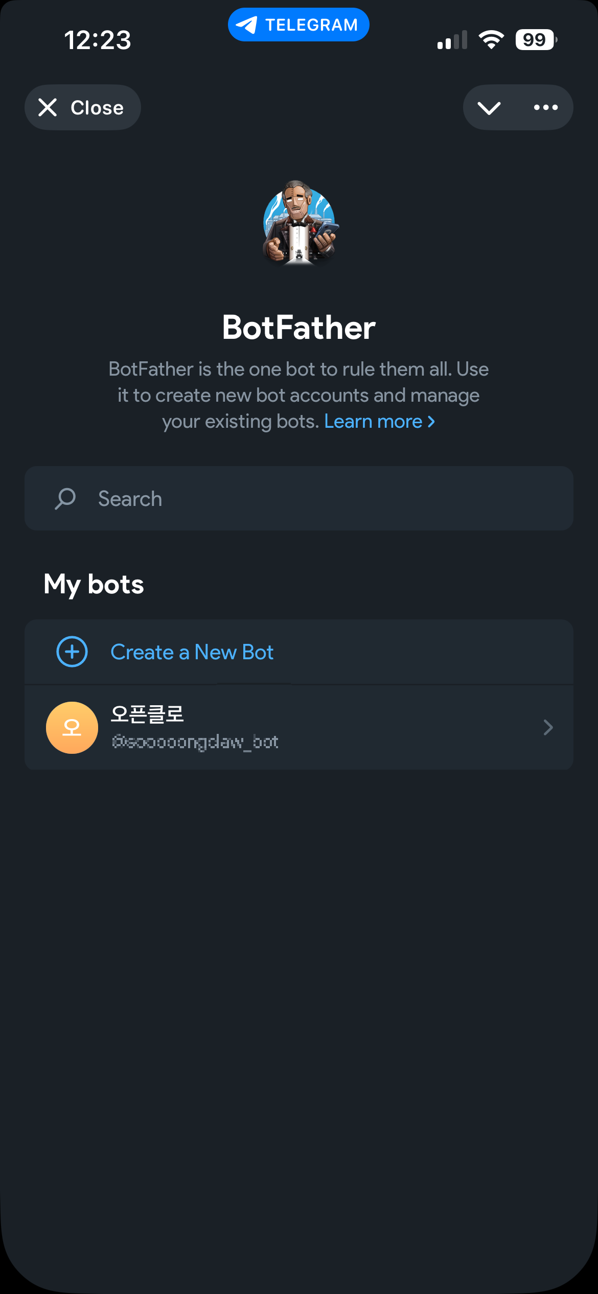 BotFather를 클릭하면, 아래와 같은 화면이 나온다.