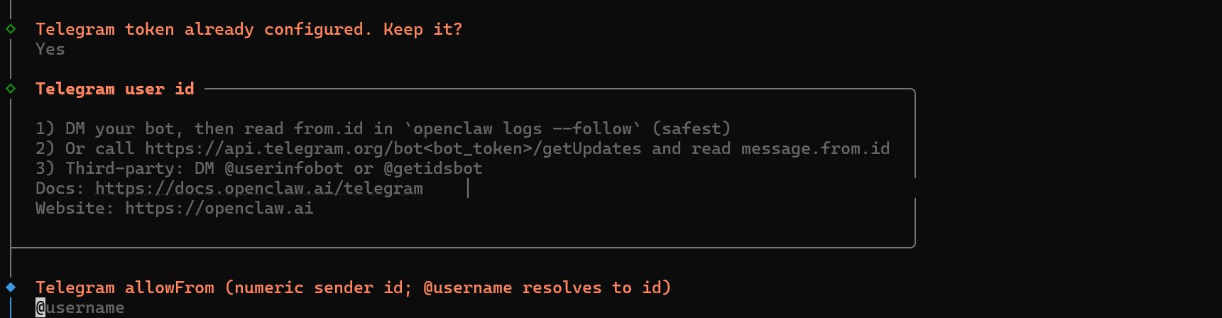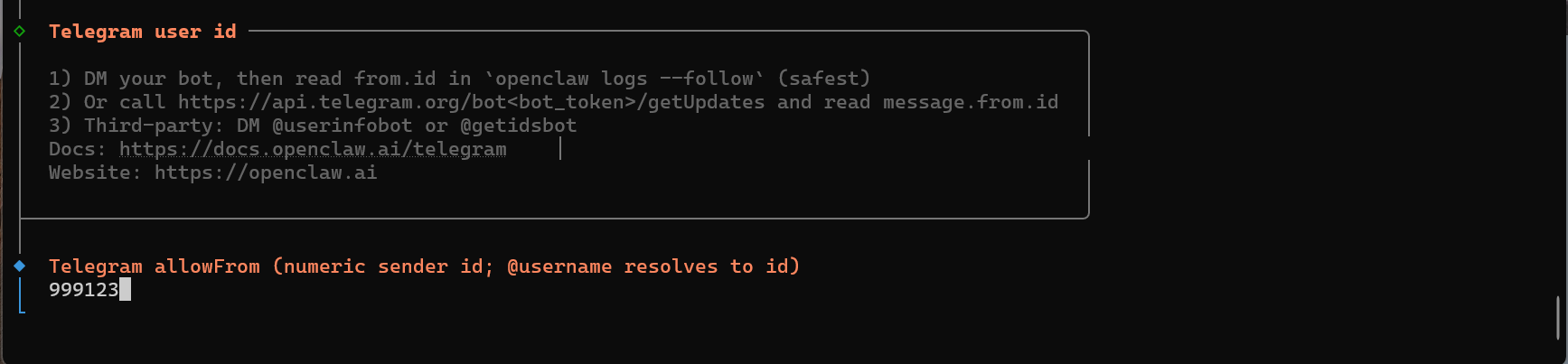 그러면 아래와 같이 Telegram allowFrom이라고 나오는데, 여기에는 사용자 본인의 telegram userId를 넣어야한다. 이걸 넣는 이유는 아무나 텔레그램에서 메세지를 보내서 AI 응답을 받지 못하도록 하기 위해서다.
