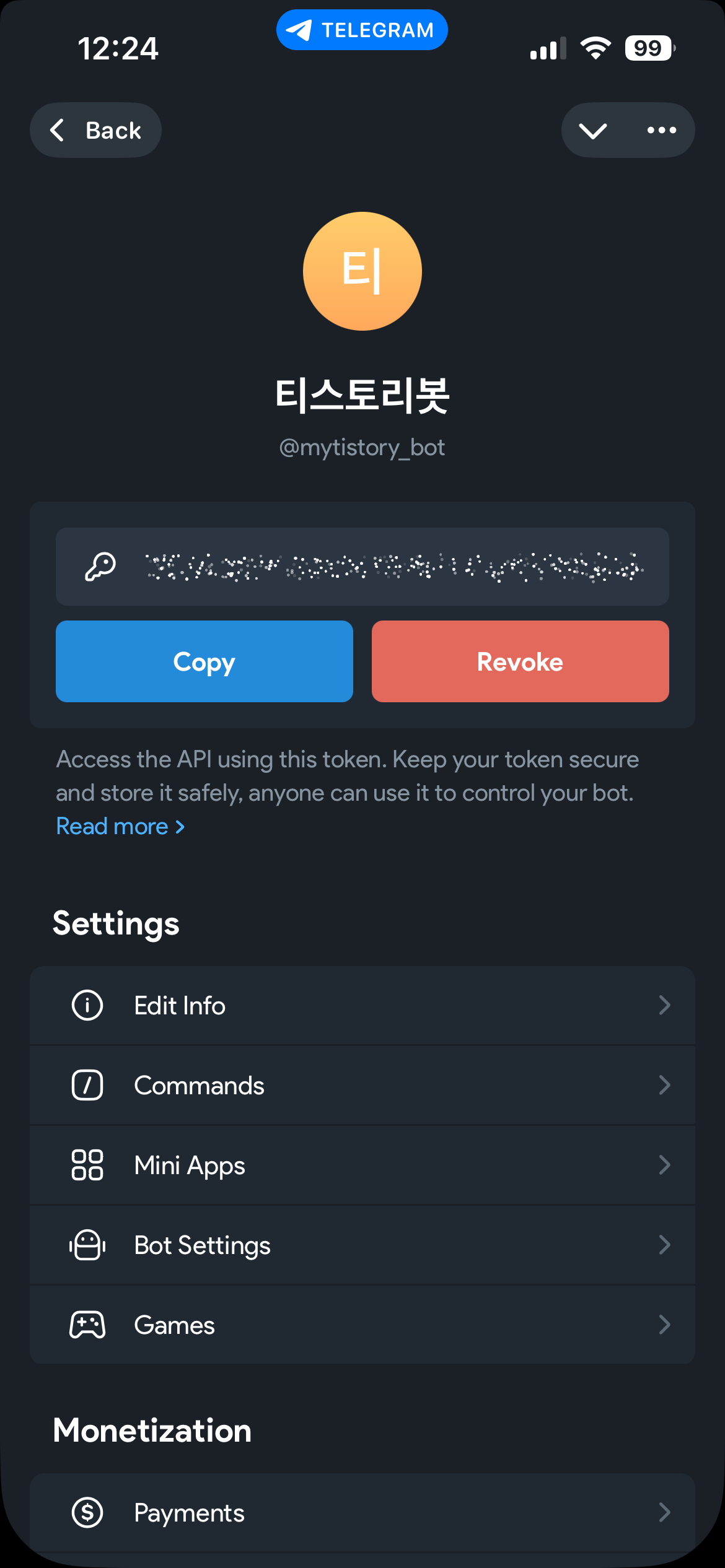 그러면 아래 화면에 나온다. Copy 버튼을 누르면 botToken이 복사된다. 이 값을 잘 가지고 있자.