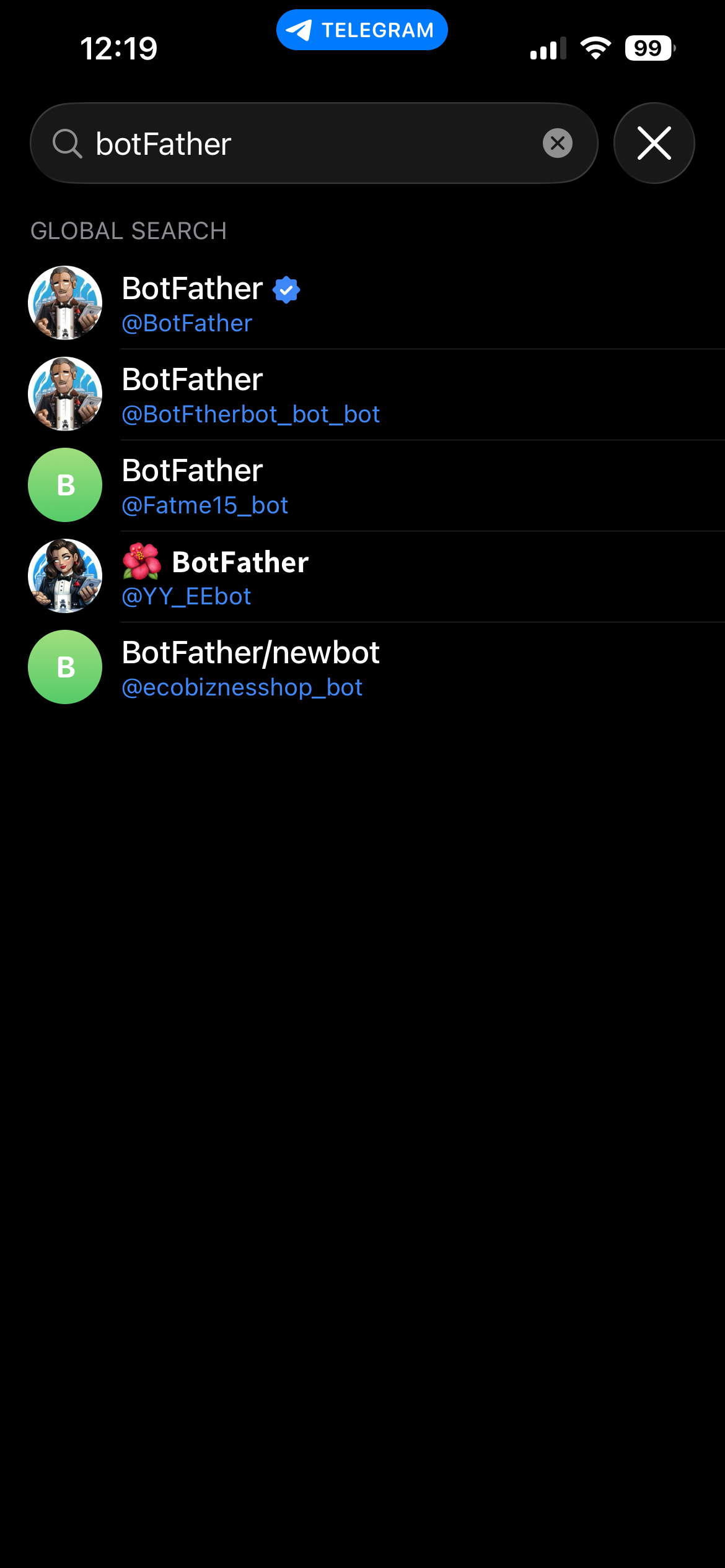 우선 텔레그램을 설치하고, 가입해서, Contacts 탭 > Search에서 botFather를 검색한다. 아래와 같이 하늘색 뱃지가 공식 계정이다.