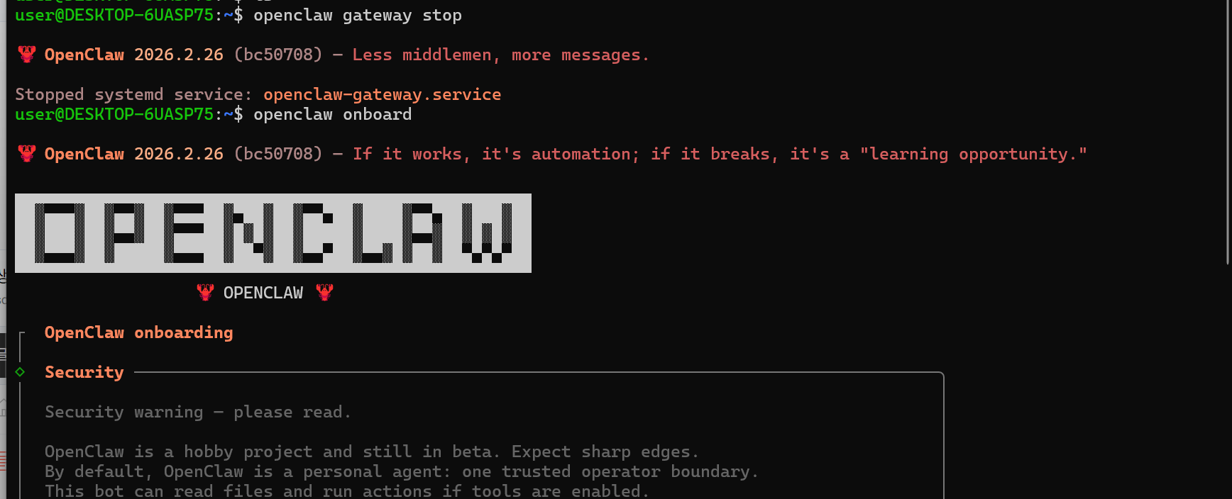 openclaw를 꺼놓아야하기 때문에 stop 명령어를 실행을 먼저한다.